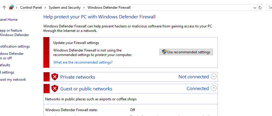 1. Open ‘Windows Defender Firewall’ and turn off all the firewalls, there should be two.