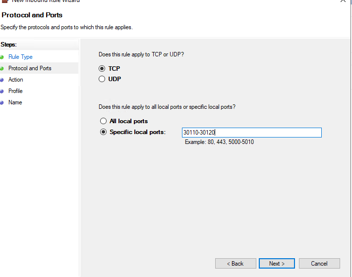 5. We need to add the ports ‘30110-30120’ for both the TCP and the UDP. It means we will have to do the same method a few times