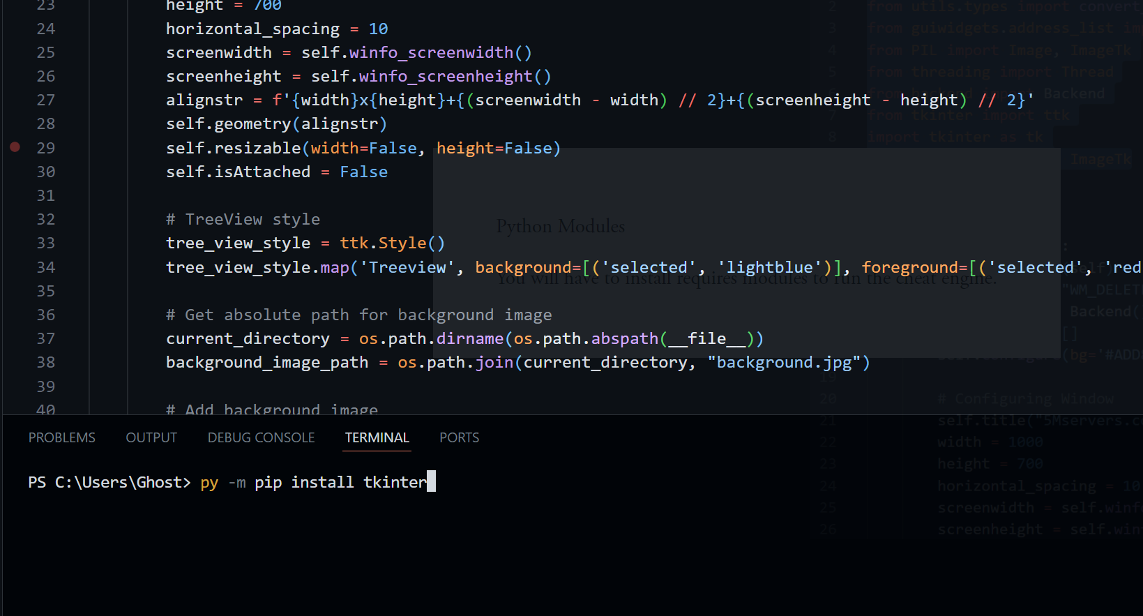 By using the Visual Studio Code terminal you can use a command such as py -m pip install tkinter which would then install a module. Do this for all missing modules